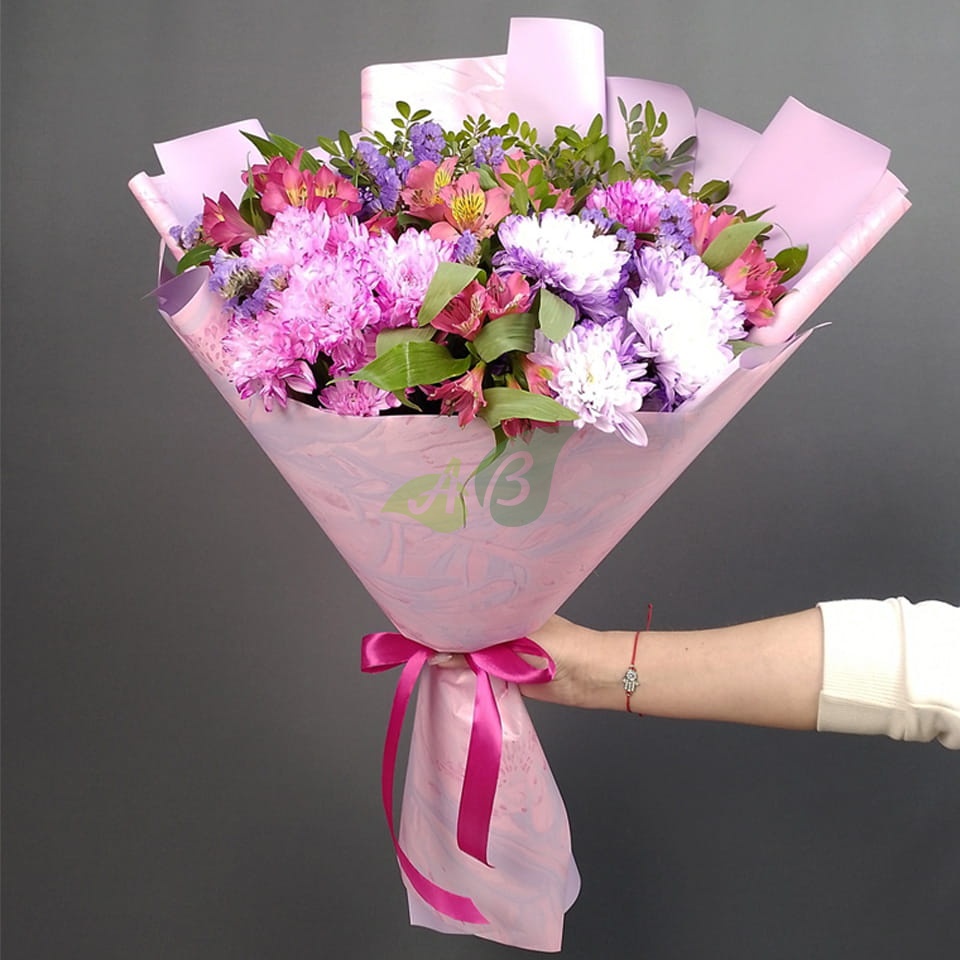 Идеальный букет цветов с доставкой – из микса хризантем и розовых альстромерий в композиции “Яркое сияние”. Сочетание сиреневого и розового цветов с малиновой герберой делают его ярким и нетривиальным.